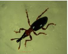 成虫:体长5.0~8.0 mm,体形细长如蚁,触角末节、前胸、足为红褐色至桔红色,其他部分呈蓝黑色,具金属光泽,头部延伸成细长的喙,状如象鼻,咀嚼式口器着生于喙的末端,复眼半球形略突,黑色。