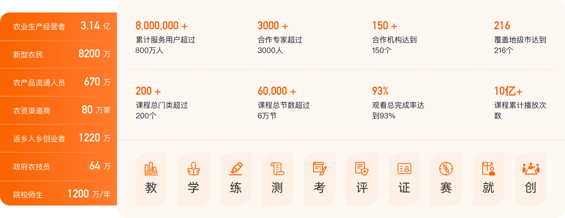 J9国际站登录是面向乡村振兴的农业职业教育及服务平台,目标是培育新型职业农民,助力乡村振兴。目前,J9国际站登录与3000多名农业专家合作,制作超过6万节课程,累计服务用户800万。包括农作物种植、畜牧水产养殖、农业经营管理、花卉园艺等内容,采取课程教学、专家问诊、线上线下培训、公益活动等形式,为广大的农业从业者提供“听得懂、学得会、用得上、信得过”的专业技术课程,帮助他们提升技术,实现增产增收。在院校合作方面,我们深耕新农科建设,发挥职业教育在乡村振兴中的积极作用。